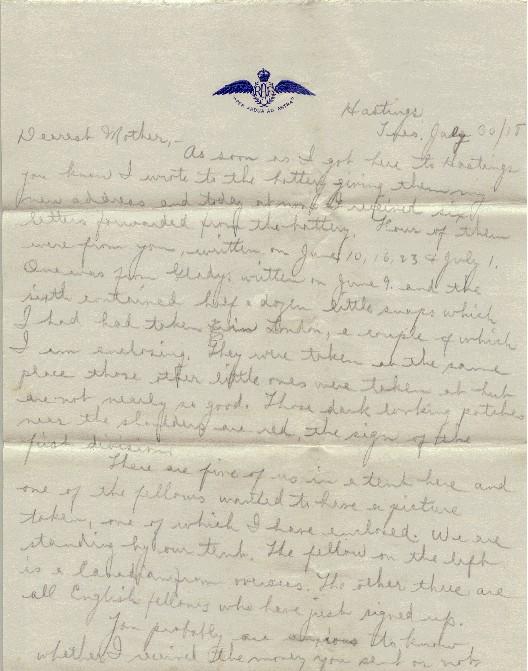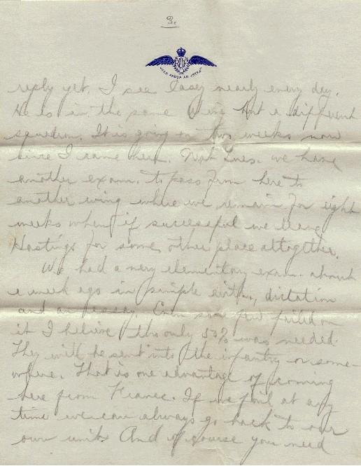 Now, Casey wrote about the same time to the Bank of Montreal about money for him there and has received no reply yet. I see Casey nearly every day. He is in the same Wing, but a different squadron. It is going on two weeks now since I came here. Next Tues. we have another exam to pass from here to another wing where we remain for eight weeks when, if successful, we leave Hastings for some other place altogether.