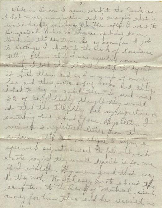You probably are anxious to know whether I received the money you sent or not. While in London, I never went to the Bank as I had money enough then and I thought that it would hardly be there yet. Then after I went to Hampstead, I had no chance of being down town in the day time. So, as soon as I got to Hastings, I wrote to the Bank of Commerce telling them that I was expecting some money. I told them that I wished to deposit it with them and as I was out of money here, and there were a few books and things I had to buy, I asked them to send me £2 of it. I hardly thought they would do that tho till they had my signature or something, but about four days later, I received a registered letter from them containing the £2, a cheque to sign, a specimen signature card to fill out, and a note saying they would deposit it for me if I wished. They seem good that way, do they not?