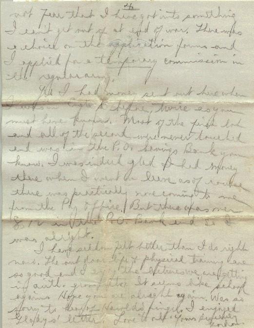 We had a very elementary exam about a week ago in simple arith., dictation and an essay. Even so, a few failed on it, I believe tho only 50% was needed. They will be sent into the infantry or somewhere. That is one advantage of coming here from France. If we fail at any time, we can always go back to our own unit. and, of course, you need not fear that I have got into something I can't get out of at end of war. There was a choice on the application forms and I applied for a temporary commission in regular army.