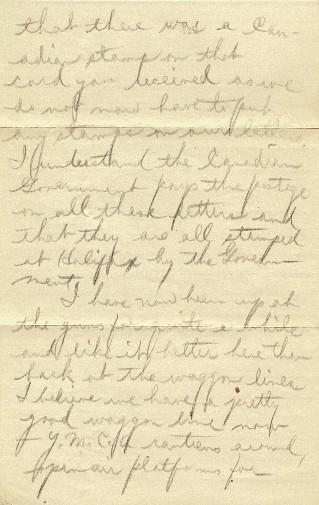 Evidently from your letter, Gladys and Harold got home for Easter all right but Cecil apparently stayed in Galt. Gladys got out to Athens - did she while she was home? I was surprised to hear that there was a Canadian stamp on that card you received as we do not now have to put any stamps on our letters. I understand the Canadian Government pays the postage on all these letters and that they are all stamped at Halifax by the Government.