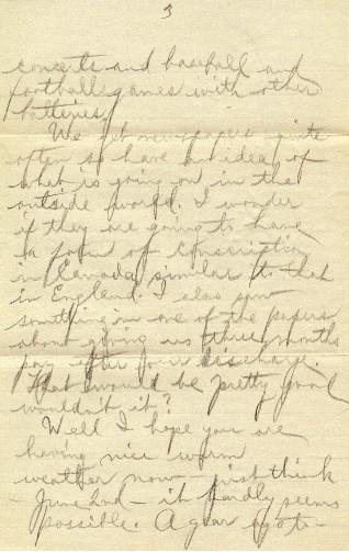 We get newspapers quite often so have an idea of what is going on in the outside world. I wonder if they are going to have a form of conscription in Canada, similar to that in England. I also saw something in one of the papers about giving us three months pay after our discharge. That would be pretty good wouldn't it?
