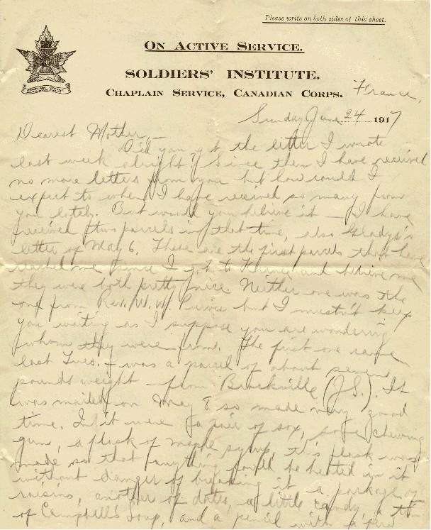 Did you get the letter I wrote last week alright? Since then I have received no more letters from you but how could I expect to when I have received so many from you lately. But, would you believe it - I have received two parcels in that time, also Gladys's letter of May 6. Those are the first parcels that have reached me since I got to France and believe me they were both pretty nice. Neither one was the one from Rev. W.W. Purvis but I mustn't keep you waiting as I suppose you are wondering whom they were from. The first one came last Tues - was a parcel of about seven pounds weight - from Brockville (J.S.). It was mailed on May 8 so made very good time. In it were a pair of sox, some chewing gum, a flask of maple syrup (this flask was made so that anything could be heated in it without danger of breaking it), a package of raisins, another of dates, a little candy, a tin of Campbell's soup, and a pencil with a few envelopes and some paper. One of the envelopes was self addressed. It was evident that an immediate answer was desired so I sent one next day, telling what I thought of parcel, etc. You will probably wonder at my getting such a parcel from such a source (by the way, I believe there is another on its way, sent about six weeks previously) but I believe she has more than one friend at the front in whom she takes an interest, and like other girls I have heard about, she seems to make much of the soldier part of it - anyone at the front fighting seems to appeal. By the way, she has often said she would like to meet my sister. If Wilbert wants Gladys to go to B.B. with him some day for a trip, she would have that chance.