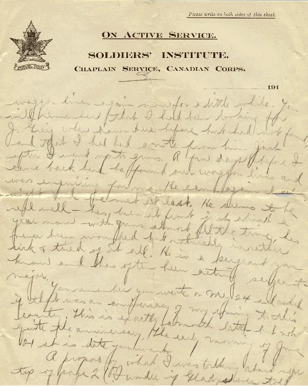 Weather has been a little wet and cooler lately but nice today. I am back at the waggon lines again now for a little while. You will remember that I had been looking for J. Greig when down here before, but had not found him and that I had had a note from him just after I went up to guns. A few days before I came back here, he found our wagon lines and was enquiring for me. He came again last night and we met at last. He seems to be real well - has been at front just about a year now with guns almost all the time - has never been wounded but naturally is rather sick & tired of it all. He is a sergeant, you know, and has often been acting sergeant-major.