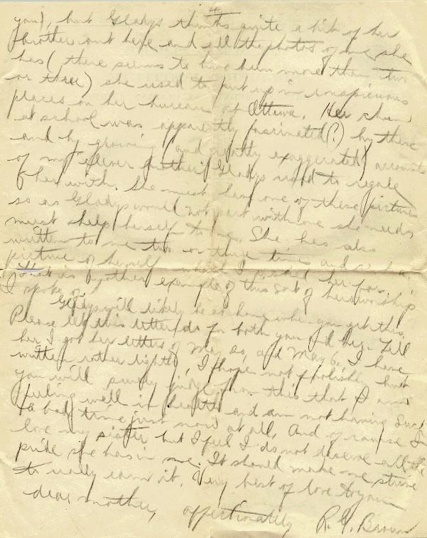A propos of what I was talking about - top of page 2 (I wonder if Gladys ever told you), but Gladys thinks quite a bit of her brother out here and all the photos of me she has (there seems to have been more than two or three), she used to put up in conspicuous places on her bureau at Ottawa. Her chum at school was apparently fascinated(?) by these and by glowing (and greatly exaggerated) accounts of "my clever brother" Gladys used to regale her with. She must have one of these pictures so, as Gladys would not part with one, she needs must help herself to one. She has also written to me two or three times and sent a picture of herself which I asked her for. That is another example of this sort of hero worship I spoke of.