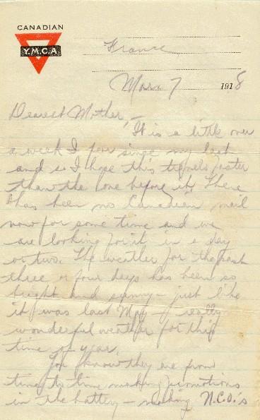 It is a little over a week I fear since my last and so I hope this travels faster than the one before it. There has been no Canadian mail now for some time and we are looking for it in a day or two. The weather for the past three or four days has been so bright and sunny - just like it was last May - really wonderful weather for this time of year.