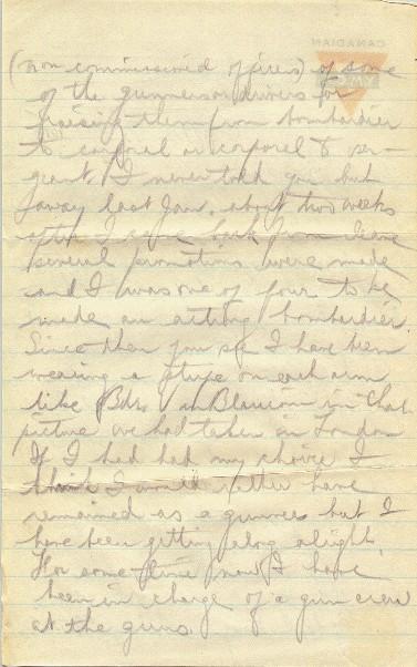 You know, they are from time to time making promotions in the battery - making N.C.O's (non-commissioned officers) of some of the gunners or drivers or raising them from bombardier to corporal or corporal to sergeant. I never told you but away last Jan., about two weeks after I came back from leave, several promotions were made and I was one of four to be made an acting bombardier. Since then, you see, I have been wearing a stripe on each arm like Bdr. Van Blaricom in that picture we had taken in London. If I had had my choice, I think I would rather have remained as a gunner, but I have been getting along alright. For some time now I have been in charge of a gun crew at the guns.