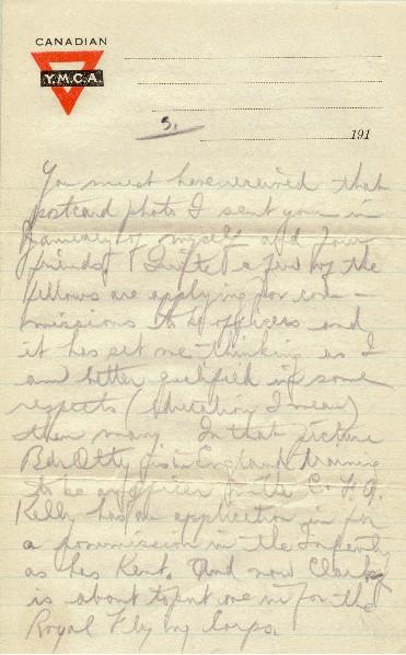 You must have received that post card photo I sent you in January of myself and four friends. Quite a few of the fellows are applying for commissions to be officers and it has set me thinking as I am better qualified in some respects (education, I mean) than many. In that picture, Bdr. Otty is in England training to be an officer in the C.F.A. Kelly has an application in for a commission in the Infantry as has Kent. And now, Clark is about to put one in for the Royal Flying Corps. It usually takes several months for an application to go thru but depends on circumstances. Otty was a long time in getting his. Then, it means from four to six or more months training in England, besides leave, when one is out of war altogether really. Seeing so many of the best fellows trying for it, makes me think that, if I made up my mind to it, I could do it to. You know my trouble - not enough initiative or leadership. I don't want one in the infantry or artillery where it is necessary to take charge of bodies of men. I look too young, I think, for such a job.