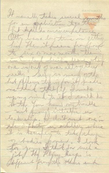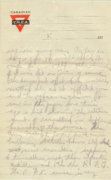 The Flying Corps is different from the others and requires young men. As far as danger goes, one might think it more dangerous than other branches. If I was set on joining, of course, the danger part of it really wouldn't matter, only as it affected you and to reassure you - I saw in the paper some time ago a list showing the relative amt. of casualties in different branches of the service. The Army Medical Corps (field ambulances, stretcher bearers, etc.) had most casualties, sappers, & tunnellers next, then - infantry artillery and 5th, the R.F.C. The R.F.C. course is very strenuous but I could stand it, if others can. There are many things in favour of it. I would be learning something and making use of what I do know. Here, one is apt to forget all he knows and has to be at the beck and call of N.C.O.'s and officers, some of whom one wouldn't recognize in civilian life. Then, of course, if I ever got a commission, the pay is many times as large and meals & quarters much better. One has to see the Major of the battery, then the Col. of the Brigade & finally some Gen., and one has to be medically fit.