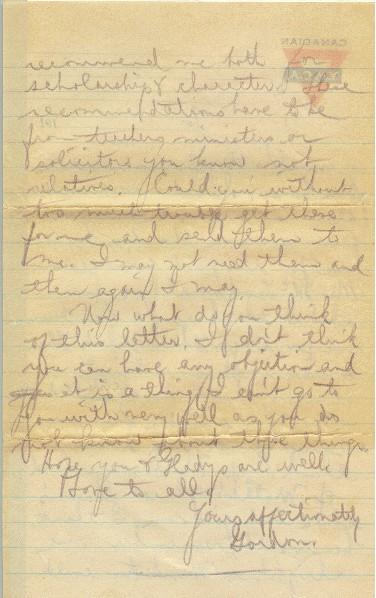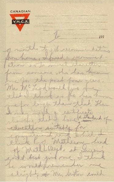 The application form is rather a formidable one. I have two kinds here and if I have to use the latest one I got, I shall have to wait a couple of months to get recommendations from home. I need a recommendation as to moral character from someone who has known me for the past four years. Mr. McLeod would give me that I think as he has known me for longer than that. Then, I may need a certificate showing that I have a standard of education suitable for commissioned rank which I think Prof. Matheson - head of Math. Dept. at Queen's could best give me. I think he would remember me alright. Mr. Sexton could recommend me both for scholarship & character. These recommendations have to be from teachers, ministers or solicitors you know, not relatives. Could you, without too much trouble, get these for me and send them to me? I may not need them and then again I may.