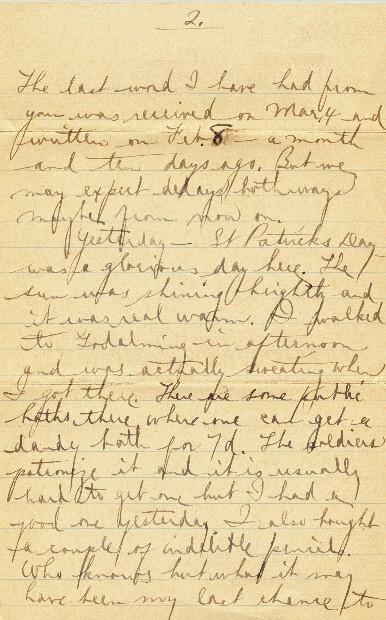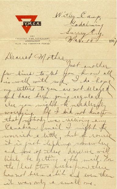 Just another few lines to let you know all is well with me. I do hope my letters to you are not delayed and have been going regularly else you might be needlessly worrying. If I did not know that nobody was receiving any Canadian mail, I might be worried a little, but of course, it is just held up somewhere and one of these days we will likely be getting a big mail. For the last two weeks now, there has not been a bit and even then, it was only a small one. The last word I have had from you was received on Mar. 4 and written of Feb. 8 - a month and ten days ago. But, we may expect delays both ways maybe from now on. Yesterday - St. Patrick's Day, was a glorious day here. The sun was shining brightly and it was real warm. I walked to Godalming in afternoon and was actually sweating when I got there. There are some public baths there where one can get a dandy bath for 7d. The soldiers patronize it and it is usually hard to get one, but I had a good one yesterday. I also bought a couple of indelible pencils. Who knows but what it may have been my last chance to get to Godalming. My next letter may be written from somewhere else, I don't know.
