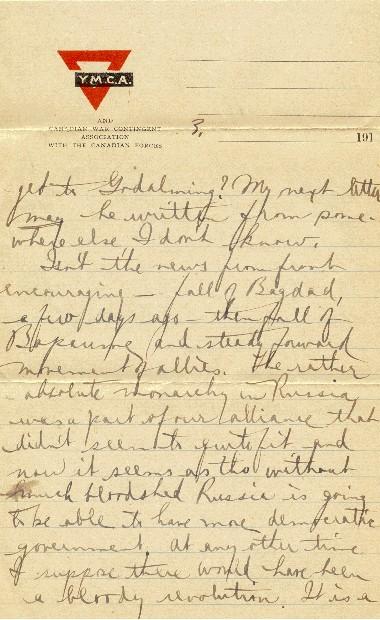 Isn't the news from Front encouraging - fall of Bagdad, a few days ago - then fall of Bapaume and steady forward movement of allies. The rather absolute monarchy in Russia was a part of our alliance that didn't seem to quite fit and now it seems as tho without much bloodshed Russia is going to be able to have more democratic government. At any other time I suppose there would have been a bloody revolution. It is a forward step in Russia, much to be desired.