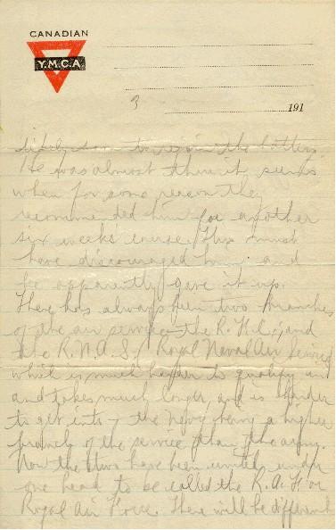 I fear that Musgrave who has been taking an officer's R.F.C. course for sometime and was nearly thru, is now back in the artillery at Witley and likely soon to rejoin the battery. He was almost thru, it seems, when for some reason, they recommended him for another six week's course. This must have discouraged him and he apparently gave it up. There has always been two branches of the air service - the R.F.C. and the R.N.A.S. (Royal Naval Air Service) which is much harder to qualify in and takes much longer, and is harder to get into - the navy being a higher branch of the service than the army. Now, the two have been united under one head to be called the R.A.F. or Royal Air Force. There will be different branches as aeroplanes, seaplanes, or airships. To get into it, a fellow has to be British born & of British parentage and between the ages of 17 yrs, 9 mos & 30 yrs. I think it is just as well they are united.