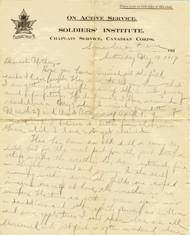 There has been an odd dull or rainy day lately, but for the most part for the past two or three weeks, the weather has been extremely fine - bright, warm and sunny. In the early morning, walking across the fields, one could imagine oneself at home, the weather is so similar. The trees are getting green again now - dandelions and other spring flowers are in bloom and some apple trees I saw near here are all blossomed out. At first, I often wondered where they got the expression "sunny France" but now it seems more appropriate and then too, we are probably not in the sunniest part. I was for a time, back at the wagon lines but am now up at the guns and like it better. I have been trying to locate Joe Greig. I was out several evenings from our wagon lines trying to find theirs. They are not far away. I learned that that battery was split up some time ago and what to look for, but was not successful. I wrote him telling what I was in and a few days later had a note from him that he got to me somehow or other, so I may see some of them soon.