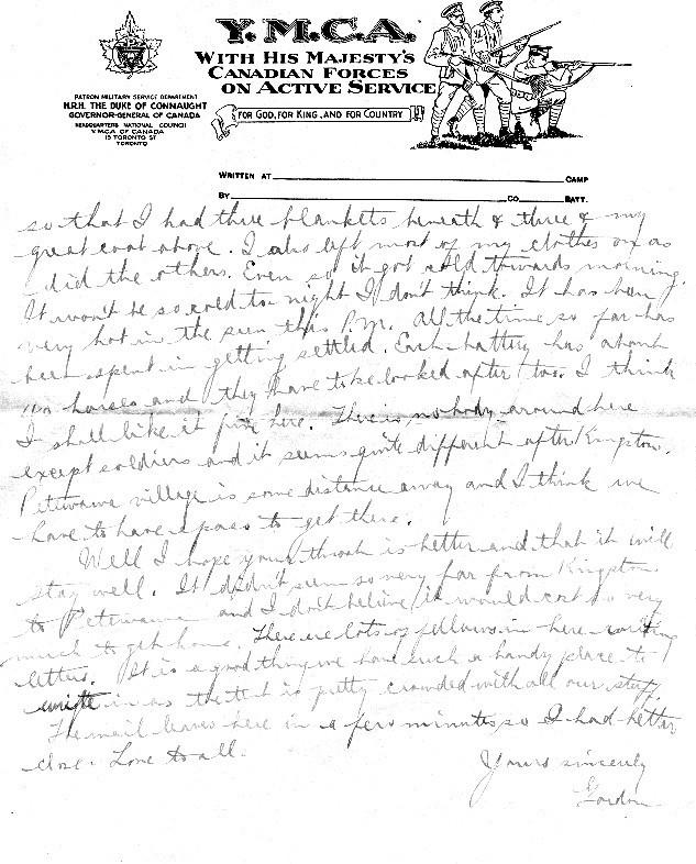Well, I hope your throat is better and that it will stay well. It didn't seem so very far from Kingston to Petawawa and I don't believe it would cost so very much to get home. There are lots of fellows in here writing letters. It is a good thing we have such a handy place to write in as the tent is pretty crowded with all our stuff. The mail leaves here in a few minutes, so I had better close. Love to all.