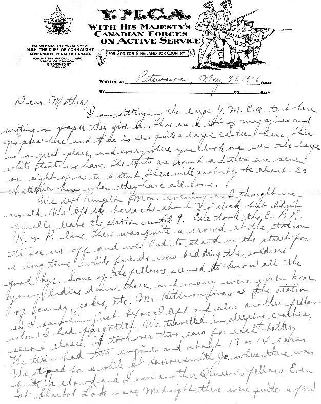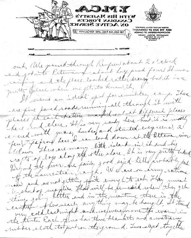 I am sitting in the large YMCA tent here, writing on paper they give us. There are a lot of magazines and papers here and there is also quite a large canteen here. This is a great place, and everywhere you look, one sees the large white tents we have. The tents are round and there are seven or eight of us to a tent. There will probably be about 20 batteries here when they have all come. We left Kingston Mon. evening as I thought we would. We left the barracks about 7 o'clock but didn't finally leave the station until 9. We took the C.P.R K. & P. line. There was quite a crowd at the station to see us off and we had to stand on the street for a long time while friends were bidding the soldiers goodbye. Some of the fellows seemed to know all the young ladies down there and many were given boxes of candy, cakes, etc. Mr. Hitsman was at the station so I saw him just before I left and also another fellow whom I had forgotten. We travelled in sleeping coaches, second class. It took over two cars for each battery. The train had two engines and about 13 cars. We stopped for awhile at Harrowsmith Jct. Where there was quite a crowd and I saw another Queen's fellow. Even at Sharbot Lake near midnight, there were quite a few out. We passed through Renfrew about 2 o'clock and got into Petawawa about half past four. It was raining and the place looked rather dreary but it is a pretty place when one gets to know it.