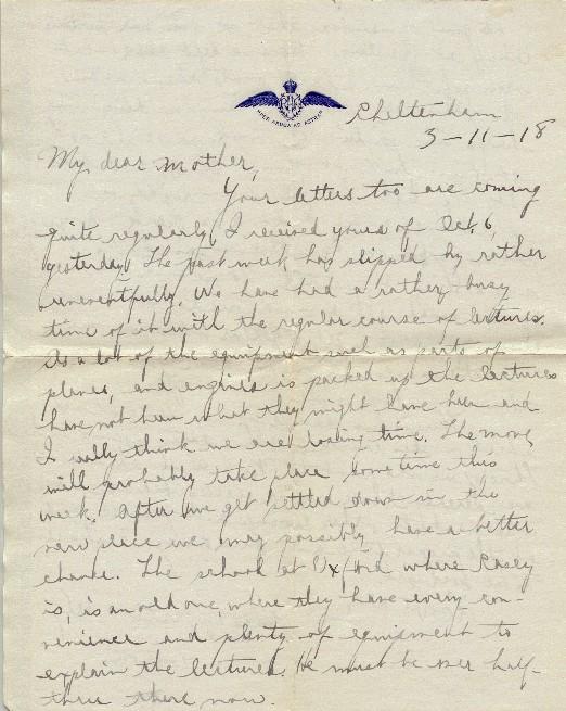 Your letters too are coming quite regularly. I received yours of Oct. 6, yesterday. The past week has slipped by rather uneventfully. We have had a rather busy time of it with the regular course of lectures. As a lot of the equipment, such as parts of planes, and engines is packed up, the lectures have not been what they might have been and I really think we are losing time. The move will probably take place some time this week. After we get settled down in the new place, we may possibly have a better chance. The school at Oxford, were Casey is, is an old one, where they have every convenience and plenty of equipment to explain the lectures. He must be over half thru there now.