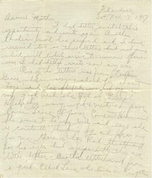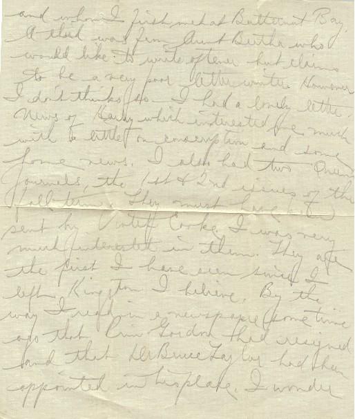One of the letters was from cousin Grace who is worrying about her absent "boys" and has already worked off a very good rest she got at Guelph. Headaches, worry, work & visitors - poor cousin Grace & poor cousin Herman. She seems to be very lonely and says she is constantly thinking of and praying for me. Clarence has had treatment for his eyes but apparently they are little better. Another letter was from a girl Eldred Lane who lives in Kingston and whom I first met at Butternut Bay. A third was from Aunt Bertha who would like to write oftener but claims to be a very poor letter writer. However, I don't think so - I had a lovely letter. News of Harley which interested me much with a little on conscription and some home news. I also had two Queen's Journals, the 1st & 2nd issues of this fall term. They must have been sent by Violet Cook. I was very much interested in them. They are the first I have seen since I left Kingston, I believe. By the way, I read in a newspaper some time ago that Prin. Gordon has resigned and that Dr. Bruce Taylor had been appointed in his place. I wonder when that took effect. The Journals I received do not mention it.
