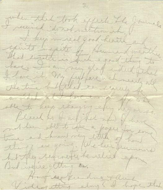 I keep in real good health and spirits, inspite of the weather. That sweater is such a good thing to have. I am very glad indeed that I have it. My feet are wet nearly all the time but that can scarcely be avoided and I have enough sox to be able to keep changing every day or so. Placed as I am just now, I have not been able to see a paper for some time and know very little of how things are going. We hear rumours but they can never be relied upon. But, we're getting on.