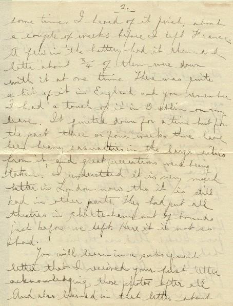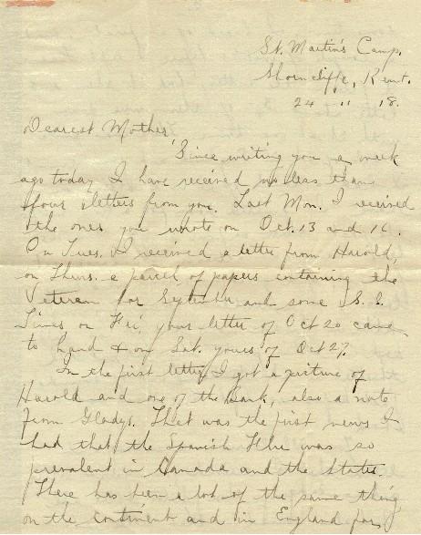 In the first letter I got a picture of Harold and one of the Bank, also a note from Gladys. That was the first news I had that the Spanish Flu was so prevalent in Canada and the States. There has been a lot of the same thing on the continent and in England for some time. I heard of it first, about a couple of weeks before I left France. A few in the battery had it then and later about ¾ of them were down with it at one time. There was quite a bit of it in England and, you remember, I had a touch of it in Dublin on my leave. It quieted down for a time, but for the past three or four weeks, there have been heavy casualties in the large cities from it, and great precautions were being taken. I understand it is very much better in London now, tho it is still bad in other parts. They had put all theatres in Cheltenham out of bounds just before we left. Here it is not so bad.