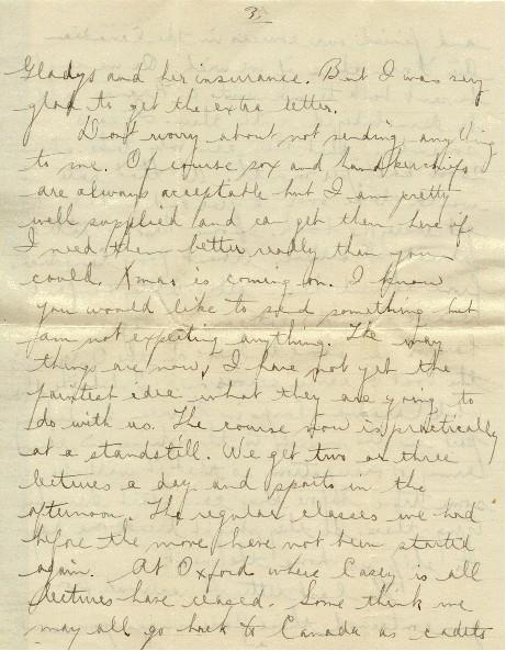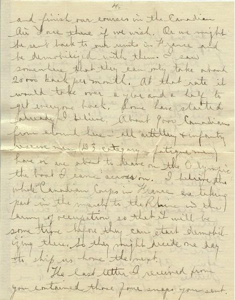 Don't worry about not sending anything to me. Of course sox and handkerchiefs are always acceptable but I am pretty sell supplied and can get them here if I need them, better really than you could. Xmas is coming on. I know you would like to send something, but am not expecting anything. The way things are now, I have not yet the faintest idea what they are going to do with us. The course now is practically at a standstill. We get two or three lectures a day and sports in the afternoon. The regular classes we had before the move have not been started again. At Oxford, where Casey is, all lectures have ceased. Some think we may all go back to Canada as cadets and finish our courses in the Canadian Air Force there if we wish. Or we might be sent back to our units in France and be demobilized with them. I saw somewhere that they can only take about 20,000 back per month. At that rate, it would take over a year and a half to get everyone back. Some have started already, I believe. About 9,000 Canadians from around here - all artillery & battery reserve men (D3 category - fatigue men) have or are about to leave on the "Olympic", the boat I came across on. I believe the whole Canadian Corps in France are taking part in the march to the Rhine in the army of occupation, so that it will be some time before they can start demobilizing there. So, they might decide one day to ship us home the next.