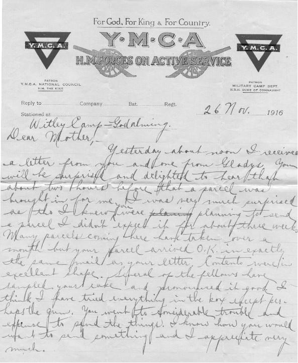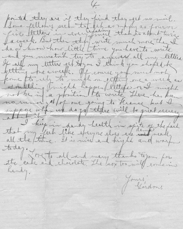 I have taken a notion to write a few more letters than I used to. I have written cousin Grace twice since coming here and Clarence once. I have also written to Gladys three or four times. By writing more, I find I get more letters and it is so nice to get letters here from Canada. You should see the fellows crowd around when each Canadian mail comes in and how disappointed they are if they find they get no mail. Some fellows seem to get as many as four or five letters in every Canadian mail, that is about twice a week. But, then they write much more than I do. I know how little time you have to write and you mustn't try to answer all my letters. If all my letters get to you, I think you should be getting one a week. Of course, you must not come to rely too much on getting one a week as something might happen to the letters or I might not be in a position to write.