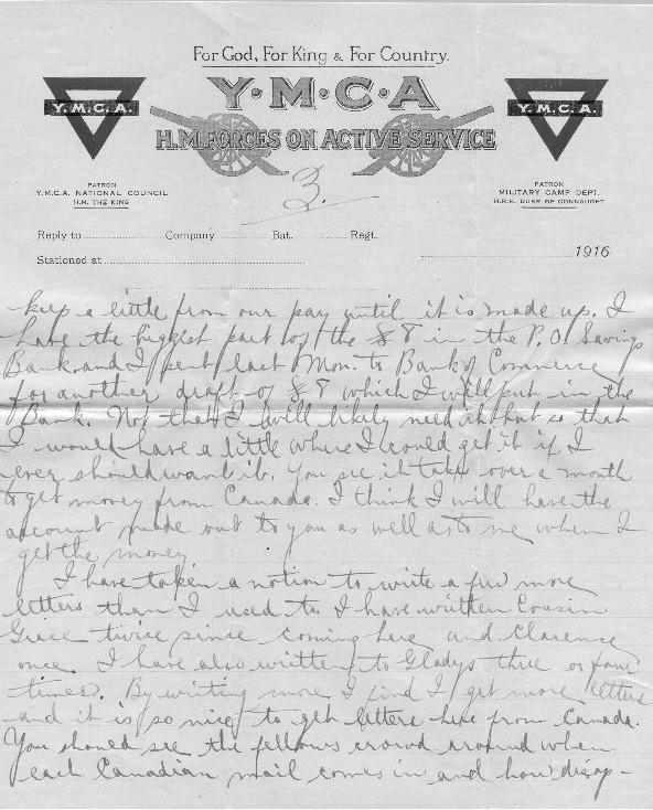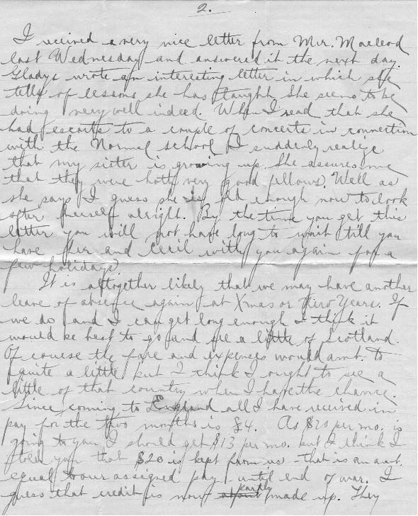 It is altogether likely that we may have another leave of absence again at Xmas or New Years. If we do and I can get long enough, I think it would be best to go and see a little of Scotland. Of course, the fare and expenses would amt. to quite a little, but I think I ought to see a little of the country when I have the chance. Since coming to England, all I have received in pay for the two months is £4. As $20. per mo. is going to you, I should get $13. per mo. but I think I told you that $20. is kept from us - that is an amt. equal to our assigned pay - until end of war. I guess that credit is now partly made up. They keep a little from our pay until it is made up. I have the biggest part of the £8 in the P.O. Savings Bank and I sent last Mon. to Bank of Commerce for another draft of £8 which I will put in the Bank. Not that I will likely need it, but so that I would have a little where I could get it if I ever should want it. You see, it takes over a month to get money from Canada. I think I will have the account made out to you as well as to me when I get the money.