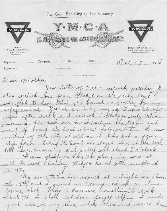 Your letter of Oct. 1 received yesterday. I also received one from Gladys on the same day. I was glad to hear that you learned so quickly of my safe arrival. Yes, we went by way of Truro but it was after dark and arrived in Halifax early Mon. morning. We had our breakfast on the train and went on board the boat about half past ten. I saw nothing of the city at all as it was but a few steps from train to boat. We stayed there at the dock till Tues. morning and pulled out about 8 o'clock. I am glad you have the phone in now, it will be real handy. Gladys & Harold both mentioned it too.