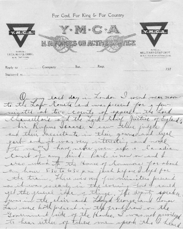 On my last day in London, I went near noon to the Law Courts and was present for a few minutes at two courts of appeal - the Lord Chancellor's and the Lord Chief Justice of England's - Sir Rufus Isaacs. I saw these judges and their assistants in their gowns and legal garb and it was very interesting and novel to me as I have never even seen a Canadian court of any kind. Parl. is now on and I also went to the House of Commons for about an hour 5:30 to 6:30 p.m. just before I left for the train. There were very few ministers present as it was so early in the evening but I could get the general idea of things. The deputy speaker was in the chair and Lloyd George and Bonar Law were both present in the front row on the Government side of the House. I was not privileged to hear either of these men speak, tho I heard two or three of the lesser lights of each side of the House speaking in debate.