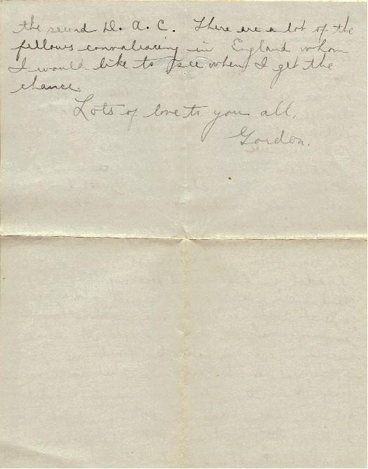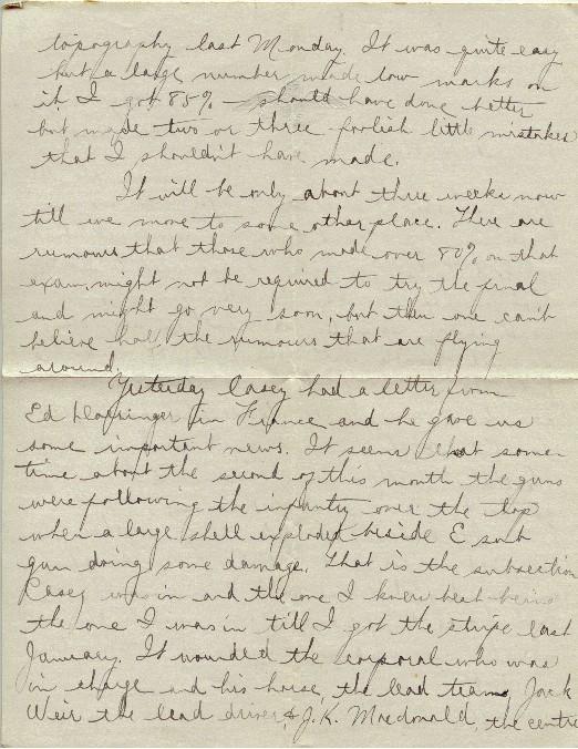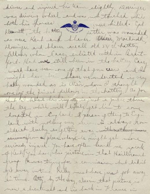 Yesterday, Casey had a letter from Ed Doeringer in France and he gave us some important news. It seems that sometime about the second of this month, the guns were following the infantry over the top when a large shell exploded beside "E" sub gun doing some damage. That is the subsection Casey was in and the one I knew best, being the one I was in till I got the stripe last January. It wounded the corporal who was in charge and his horse, the lead team, Jack Weir, the lead driver & J.K. Macdonald, the centre driver and injured his team slightly. Doeringer was driving wheel and was not touched while both his horses were killed. Cpl. Deanett(?), the battery fitter was wounded, as were Kent and Shaver. Weir, Macdonald, Doeringer and Shaver are all old 54th Battery fellows whom Casey enlisted with in Brantford. Had we still been in the battery, Casey would have been one of that gun crew, and I might have been. Shaver, we understand is very badly wounded as is Weir whom I thought one of the finest fellows in the battery. As for Kent, I believe his injury is just a piece thru the leg which will likely get him to some hospital in England. A person getting to England with nothing very serious is always considered lucky as getting away from a place where he might get more seriously injured. You have often heard me speak of Kent. You have his picture in that Haillicourt group. He was trying for a commission but didn't get away in time. Kelly must have just got away in time. Otty, by the way, also in that picture, is now a lieutenant and is back in France in the second D.A.C. There are a lot of the fellows convalescing in England whom I would like to see when I get the chance.