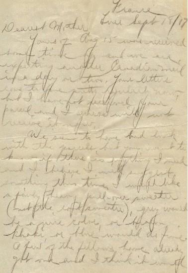Yours of Aug. 15 was received some time ago and we are expecting another Canadian mail in a day or two. Your letters come to me pretty regularly now, but I have not received your parcel and I guess will not receive it now. We seem to have bad luck with the parcels, but you want to know if there is anything I need and I believe I will suggest something this time. I would like a fairly heavy pull-over sweater (not the coat sweater), grey would be a nice colour, or brown khaki or blue would be fine. A few of the fellows have already got one and I think it would be wise for me to get one too. I have just been thinking that Aunt Lettie some time ago, when last I heard from her, wanted to send me things and that it might be most convenient if you were to write to her and get the sweater there. She could then send it to me direct from Galt.
