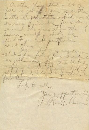 Another thing that a lot of fellows get is a pair of leather mitts or gauntlets which would be more serviceable for working around the guns than the issue would probably be. But I am not particular about them. Again let me assure you that I am feeling fine. I am not as yet in any way troubled by anything in the line of shell shock and I have been through a few things. Love to all.