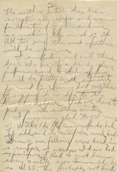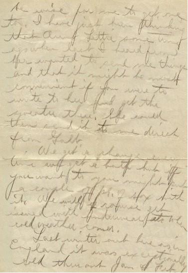 We get a change everytime we get a bath but, if you want to, you might put a couple of prs. of sox with it. We will, of course, get issued with underwear etc. when cold weather comes. Last winter out here, as in England, it was exceptionally cold throughout Jan. & Feb. The weather lately has been exceptionally clear and warm for this time of year and we are making the most of it. All too soon, the wet weather will be upon us. I am feeling real well these days. We are in a dandy place just now and I believe we will be pretty well situated for most of coming bad weather.