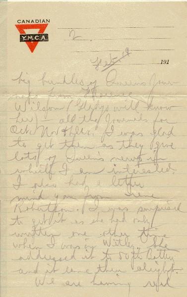 I also received three big bundles of Queen's Journals from Florence Wilson (Gladys will know her) - all the Journals for Oct., Nov. & Dec. I was glad to get them as they give lots of Queen's news in which I am interested. I also had a letter, mind you, from Irene Robertson. I was surprised to get it as she had only written one other time when I was in Witley. She addressed it to 50th Battery and it came thru alright.