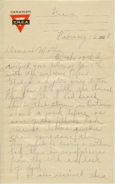 On the 13th, I received your letter of Jan. 6th with the enclosure from Gladys and also your letter of Jan. 13th with the Annual Report in it. I had heard about that storm in Ontario about a week before, as some of the fellows had received letters quicker than yours came thru. They must be having a rather bad time in some places from the cold and lack of fuel.