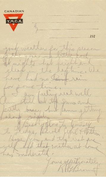 We are having real good weather for the season of the year - a little cool at nights but bright and clear in the daytime. We have had no rain for some time. I am feeling real well. Am still at the guns and pretty busy but am getting along nicely. Best of love to yourself, to Gladys, Harold, Cecil & Arthur. Hope you and the rest are well and that weather at home has moderated.