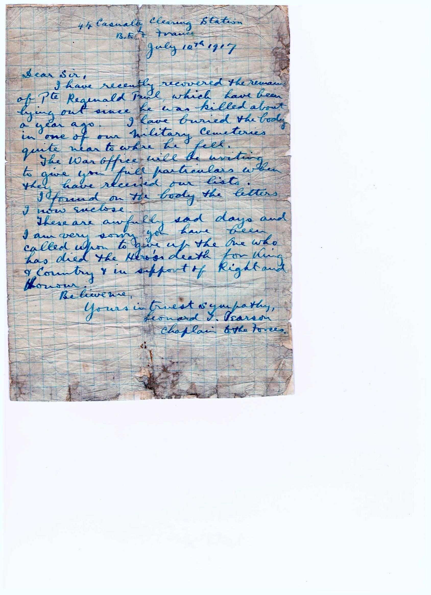 I have recently recovered the remains of Pte Reginald Paul, which have been lying out since he was killed about a year ago. I have buried the body in one of our military cemeteries quite near to where he fell.