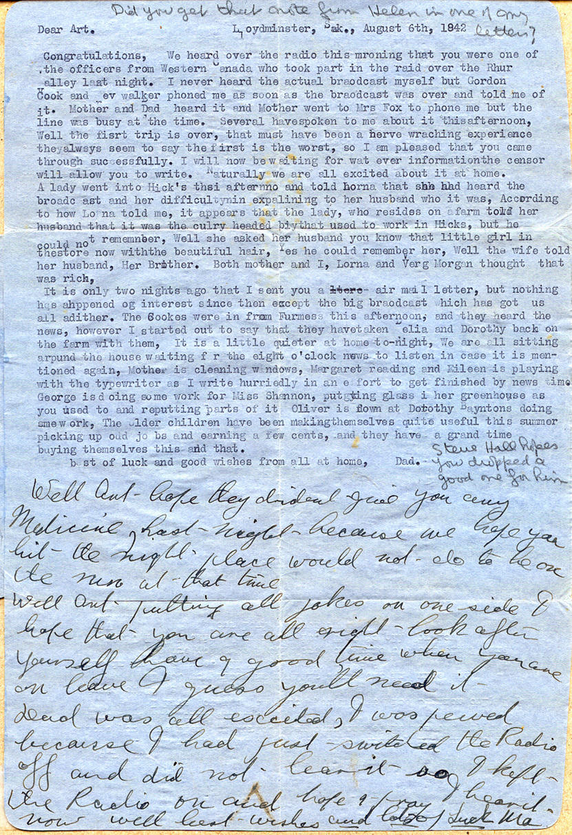 Congratulations, We heard over the radio this morning that you were one of the officers from Western Canada who took part in the raid over the Rhur Valley last night. I never heard the actual broadcast myself but Gordon Cook and rev walker phoned me as soon as the broodcast was over and told me of it. Mother and Dad heard it and Mother went to Mrs Fox to phone me but the line was busy at the time. Several have spoken to me about it this afternoon, Well the fisrt trip is over, that must have been a nerve wraching experience theyalwsys seem to saw the first is the worst, so I am pleased that you came through successfully. I will now be wating for wat ever information censor will allow you to write. Naturally we are all excited about it at home. A lady went into Hick's this afterno and told horna that she had heard the broadcast and her difficulty non explaining to her husband who it was, According to how Lorna told me, it appears that the lady, who resides on a farm told her husband that it was the culry headed bithat used to work in Hicks, but he could not remember, Well she asked her husband you know that little girl in the store now with the beautiful hair, Yes he could remember her, Well the wife told her husband, Her Brother. Both mother and I Lorna and Verg Morgan thought that was rich.