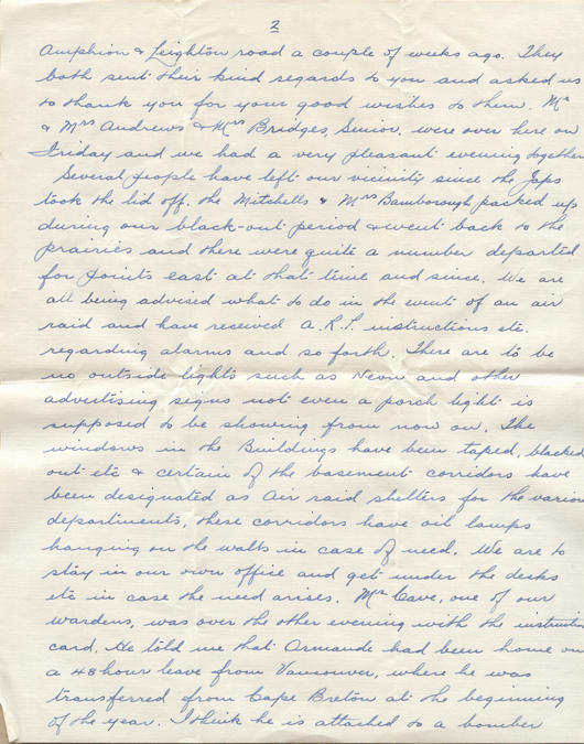 Several people have left our vicinity since the Japs took the lid off. The Mitchells and Mrs Bamborough packed up during our black-out period & went back to the prairies and there were quite a number departed for [?] east at that [?] and [?]. We are all being advised what to do in the event of an air raid and have received a R.P. instructions etc. regarding alarms and so forth. There are to be no outside lights such as Neon and other advertising signs not even a porch light is supposed to be showing from now on. The windows in the Buildings have been taped, blacked out etc & certain of the basement corridors have been designated as air raid shelters for the various departments, these corridors have oil lamps hanging on the walls on case of need. We are to stay in our own office and get under the desks etc in case the need arises. Mr [?], one of our wardens, was over the other evening with the instruction card. He told us that [?] had been home on a 48 hour leave from Vancouver, where he was transferred from Cape Breton at the beginning of the year. I think he is attached to a bomber squadron which was recently sent there but [?] is in the accountancy end of it. Bob [?] is stationed at Pat Bay but we haven't seen him yet. Some guys get all the breaks don't they? I guess Bob didn't see it that way though, when he was quarantined during training, but the delay then may have [?] in his being where he is now, who knows? Bill [?] is awaiting call to the R.[?] and Jack Hewison arrived in Toronto a week ago yesterday his dad Dad told me, but I am not sure whether he is to train as a Pilot or not. We hope that you have at last contacted George & been able to see him. From what Auntie Ethel says, he was stationed at Saffron Walden at one time and I don't think he is so very far from you now. Please give him our very best wishes when you do see him also Ted & [?]. Now, I have about exhausted the news for the present and will close with my very best wishes for your future health and safety, and remain,