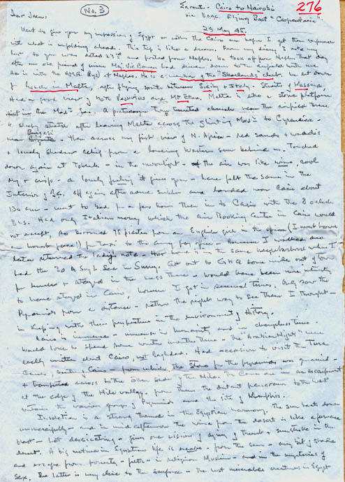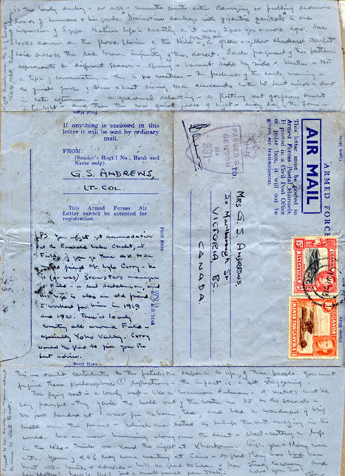 Want to give you my impression of Egypt, or rather the Cairo area before I get it confused with what is unfolding ahead. This trip is like a dream. From my diary I note my last to you was dated 23rd and posted from Naples. We took off from Naples that day after an old friend of mine, Majo Vic Bowers, had driven down to the airfield with me. He is with the AMG (Rys) at Naples. He is a member of "the Shoelands Club". We set down for lunch in Malta, after flying South between Sicily and Italy - Straits of Messina. Had a good view of both Vesuvius and Mr Etna. Malta is like a stone platform set in the Mediterranean Sea. A picturesque twin-turreted church near the airfield there. A sleepy stretch after leaving Malta across the glinting Mediterranean to Cyrenaica near Bengasi - then across my first view of N Africa - red sands & wadi's & lovely shadow-relief from a lowering Western Sun behind us. Touched down again at Tobruk - in the moonlight - the air was like wine, cool, dry and crisp - a lovely feeling it gives you. Have felt like the same in the Interior of BC. Off again after some supper and landed near Cairo 0130 am - went to bed for a few hours then into Cairo with the 8 o'clock bus. Had only Italian money which the air booking centre in Cairo would not accept, so borrowed 75 piastres from an English girl in the office (I must have an honest face!) for the Army Pay Office. However, I walked and later returned the lady's note. Her home is in the same neighbourhood where I had the 30 A Svy L Sec in Surrey. Got out to CHQ some miles out of town for lunch and stayed in the Mess there- would have been more interesting to have stayed in Cairo, however, I got in several times. Only saw the Pyramids from a distance - rather the right way to see them I thought - in keeping with their perspective in History.