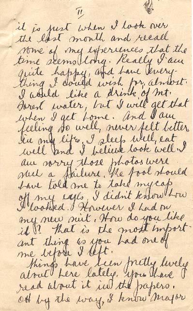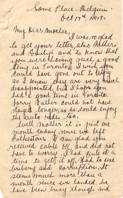 Well Mother, it is just one month to-day since we left Folkestone. I am glad you received cable O.K. and did not have to worry. I had quite a time to get it off. Had to use bribery and corruption. It seems much more than a month since we landed. We have been busy though, and it is just when I look over the last month, and recall some of my experiences, that the time seems long. Really I am quite happy, and have everything I could wish for, almost. I would like a drink of Mt. Forest water, but I will get that when I get home. And I am feeling so well, never felt better in my life. I sleep well, eat well, and I believe look well. I am sorry those photos were such a failure. The fool should have told me to take my cap off my eyes. I didn't know how I looked. However I had on my new suit. How do you like it? That is the most important thing as you had one of me before I left.