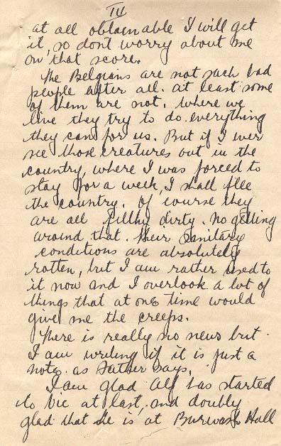 The Belgians are not such bad people after all, at least some of them are not. Where we live they try to do everything they can for us. But if I ever see those creatures out in the country, where I was forced to stay for a week, I shall flee the country. Of course they are all filthy dirty, no getting around that. Their sanitary conditions are absolutely rotten, but I am rather used to that now, and I overlook a lot of things that at one time would give me the creeps. There is really no news, but I am writing, if it is just a note, as Father says.