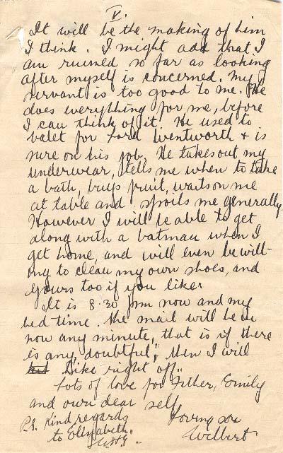 I am glad Alf has started to Vic[toria College] at last, and doubly glad that he is at Burwash Hall. It will be the making of him I think. I might add that I am ruined so far as looking after myself is concerned. My servant is too good to me. He does everything for me, before I can think of it. He used to valet for Lord Wentworth, and is sure on his job. He takes out my underwear, tells me when to take a bath, buys fruit, waits on me at table, and spoils me generally. However I will be able to get along with[out] a batman when I get home, and will even be willing to clean my own shoes, and yours too, if you like.