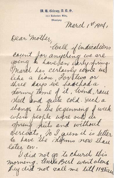 Well, if indications count for anything we are going to have an early spring. March has certainly come in like a lion. For two or three days we have had a stormy time of it. Wind, rain, sleet and quite cold. Such a change to the beginning of [the] week when people were out in spring suits and without overcoats, so I guess it is better to have the storms now than later on.