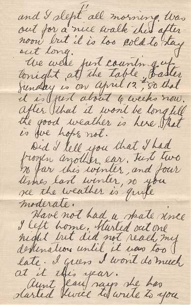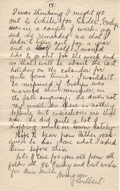 I was thinking I might go out to Whites for Easter. Evelyn was in a couple of weeks ago and she reminded me that I hadn't been out for a year and a half. I would like to go out for the week as that will be about the last holiday on the calander [sic] for quite some time. I wouldn't be surprised if Evelyn was married this Summer, in the Fall anyway. She does not say much as there is nothing definite but indications are that way. She did quite a lot of shopping while in town lately.