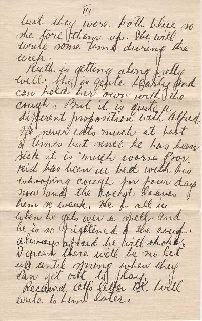 Ruth is getting along pretty well. She is quite hearty and can hold her own with the cough. But it is quite a different proposition with Alfred. He never eats much at [the] best of times but since he has been sick it is much worse. Poor kid has been in bed with his whooping cough for four days now and the cough leaves him so weak. He is all in when he gets over a spell. And he is so frightened of the cough. Always afraid he will choke. I guess there will be no let-up until Spring when they can get out to play. Received Alf's letter O.K. Will write to him later.