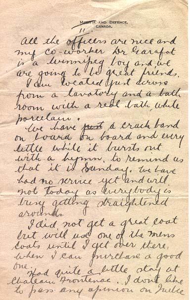 Just a line as it will probably be the last chance to write before we sail. We came on board this A.M. at 11, so we have had one meal already. And if they are all as good I will be quite satisfied. Our quarters are excellent. I am located on the Promenade deck at just about the middle of the boat. I am in with two Captains and a Lieutenant.