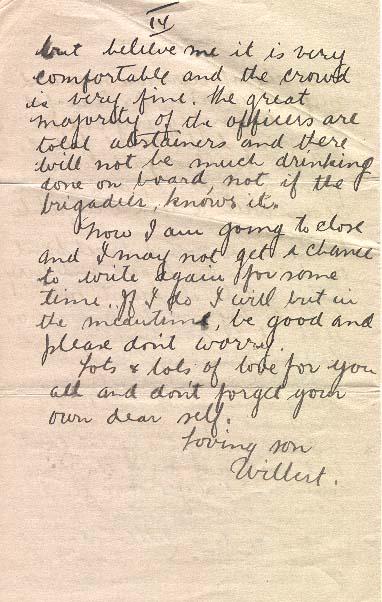 I was down below and located Roy White. He, as usual, has a cold, but will be O.K., I expect, when we get started. This old boat isn't a palace but believe me it is very comfortable and the crowd is very fine. The great majority of the officers are total abstainers and there will not be much drinking done on board, not if the Brigadier knows it.