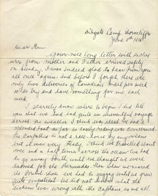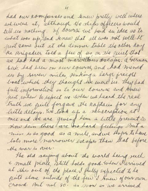 I scarcely know where to begin. I did tell you that we had quite an uneventful voyage across. The weather, I think, was ideal. We had a splendid boat, as far as easily riding was concerned. The 'Carpathia' is not a race horse by any means, but is was very steady. I think we traveled about once and a half times across the ocean. We had to go away south until we thought we were doomed for the Bermudas. Then when we neared the British shores we had to zigzag until we grew quite impatient. We did not know what the dickens was wrong with the Captain as we all had our compasses and knew pretty well where we were at, although the ship's officers would tell us nothing. Of course we had an idea of what was up, and knew that all was not well. It just came out at the dinner table the other day. The Brigadier told a few of us, on the quiet, that we had a most marvelous escape. A German sub had been on our course, and had missed us by seven miles, sinking a large freight boat, which they thought we were in. They had full information as to our course and knew just when to expect us. When we heard the real truth we quite forgave the Captain for any little delays. We took up a subscription at once, and we are giving him a little present to show him there are no hard feelings. But a miss is as good as a mile, and we hope to have lots more narrower escapes than that before the war is over.