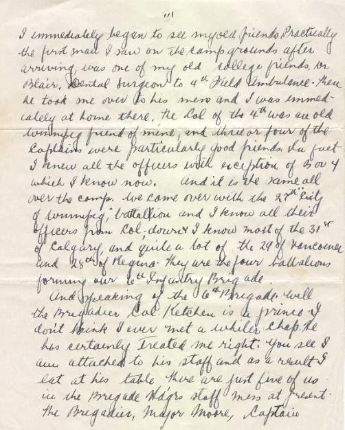 The old saying about the world being such a small place, still holds good. When I arrived at this out of the way place, I fully expected to be quite alone outside of the few I knew of our own crowd. But not so. As soon as we arrived I immediately began to see my old friends. Practically the first man I saw on the camp grounds after arriving was one of my old college friends, Dr Blair, Dental Surgeon to 4th Field Ambulance. Then he took me over to his mess and I was immediately at home there. The Col. of the 4th was an old Winnipeg friend of mine, and three or four of the Captains were particularly good friends. In fact I knew all the officers with exception of three or four which I know now. And it is the same all over the camp. We came over with the 27th City of Winnipeg battalion and I know all their officers from Col. down and I know most of the 31st of Calgary, and quite a lot of the 29th of Vancouver, and the 28th of Regina. They are the four battalions forming our 6th Infantry Brigade.