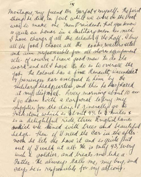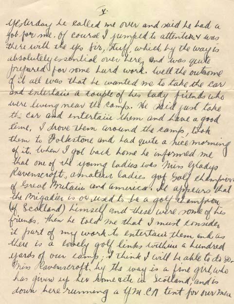 And speaking of the 6th Brigade, well the Brigadier Col Ketchen is a prince. I don't think I ever met a whiter chap. He has certainly treated me right. You see I am attached to his staff and, as a result, I eat at his table. There are just five of us in the Brigade Hdqrs. staff mess at present ? the Brigadier, Major Moore, Captain Montague, my friend Dr Garfat and myself. The first thing he did, in fact, while we were on the boat was to make me Mess President. That, you know, is quite an honor in a military mess. As such I have charge of all the details of the staff. I buy all the food, choose all the cooks, waiters, etc and am responsible for all stores, equipment etc. Of course I have good men to do the work, and all I have to do is oversee the job. The Colonel has a fine Renault laundelet [sic] 7 passenger car assigned to him by the military headquarters, and this he has placed at my disposal. Every morning about 10 I go down with a corporal to buy my supplies for the day. I generally go to Folkestone which is about 4 to 5 miles, and is a delightful ride, thru English lanes which are lined with trees and beautiful hedges. Then if I need the car in the afternoon he lets me have it and is quite put out if I walk at all. He is only 43, every inch a soldier, and treats me like a Father. He always calls me my boy, and says he is responsible for my actions. Yesterday he called me over and said he had a job for me. Of course I jumped to attention and there with the "Yes Sir" stuff, which by the way is absolutely essential over here, and was quite prepared for some hard work. Well the outcome of it all was that he wanted me to take the car and entertain a couple of his lady friends, who were living near the camp. He said just take the car and entertain them and have a good time. I drove them around the camp, took them to Folkestone and had quite a nice morning of it. When I got back home he informed me that one of the young ladies was Miss Gladys Ravenscroft, amateur ladies' golf champion of Great Britain and America. It appears that the Brigadier is, or used to be a golf champion (of Scotland) himself, and these were some of his friends. Then he told me that I must consider it part of my work to entertain them and as there is a lovely golf links within a hundred yards of our camp, I think I will be able to do so. Miss Ravenscroft, by the way is a fine girl, who has given up her home etc in Scotland, and is down here running a Y.M.C.A. tent for our men. She said she didn't see why she should play golf all day while the men were fighting, so she came down here, and is now serving the soldiers, from behind the counter from 10 A.M. to 9 P.M. So you see she is a fine type of an English lady. And quite refined too.
